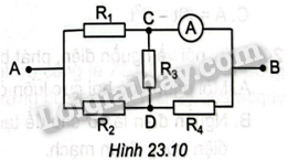 Cho mạch điện như Hình 23.10. Cho biết \({R_1} = 15\Omega \),\({R_2} = {R_3} = {R_4} = 10\Omega \). Điện trở của ampe kế và các dây nối không đáng kể.