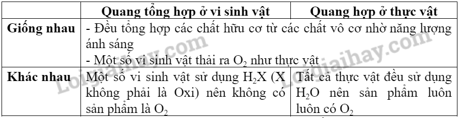 Câu hỏi 2: So sánh quang tổng hợp ở vi sinh vật và ở thực vật