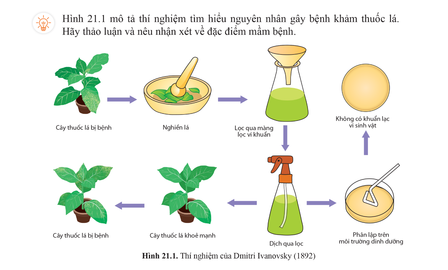 Mở đầu Hình 21.1 mô tả thí nghiệm tìm hiểu nguyên nhân gây bệnh khảm thuốc lá. Hãy thảo luận và nêu nhận xét về đặc điểm mầm bệnh.