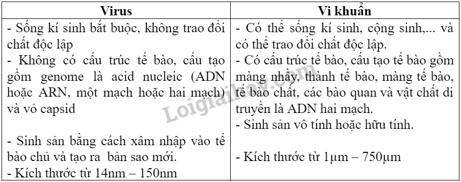 - So sánh các đặc điểm khác nhau của virus và vi khuẩn: