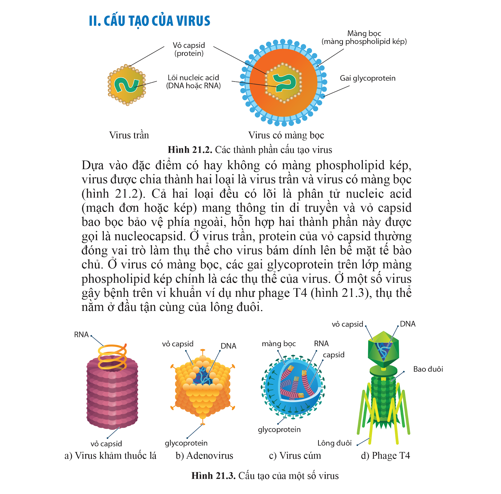 Câu hỏi 2 Quan sát hình 21.2 và cho biết các thành phần cấu tạo virus. Hãy nêu chức năng của các thành phần đó.