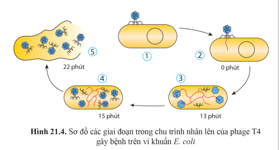 Câu hỏi 3 Quan sát các hình 21.4, 21.5 và mô tả các giai đoạn trong chu trình nhân lên của virus. Em có nhận xét gì về thời gian nhân lên của phage T4 trong tế bào chủ?