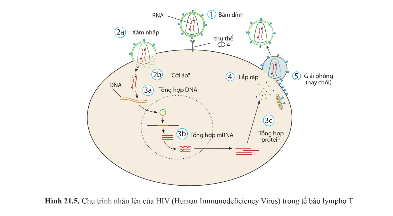 - Các giai đoạn trong chu trình nhân lên của virus: Bám dính → Xâm nhập và đưa vật chất di chuyển vào tế bào chủ → Sinh tổng hợp vật chất di truyền (DNA, RNA, Protein) → Lắp ráp → Giải phóng