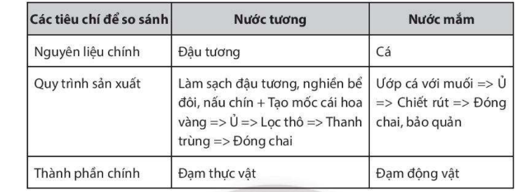Hãy so sánh nguyên liệu, quy trình sản xuất và thành phần chính của nước tương và nước mắm.