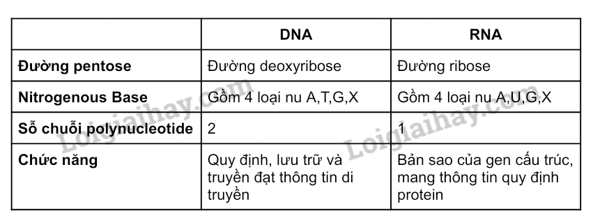 Lập bảng phân biệt DNA và RNA về đường pentose, nitrogenousbase, số chuỗi polynucleotide, chức năng. |