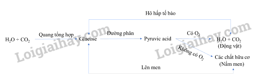 - Hô hấp tế bào và lên men là các quá trình phân giải hợp chất hữu cơ. Nếu trong tế bào có O2, glucose được phân giải thành CO2 và H2O đồng thời giải phóng năng lượng tích lũy trong các phân tử ATP; nếu trong tế bào có O2, glucose được phân giải thành lactic acid, ethanol hoặc các chất hữu cơ khác.