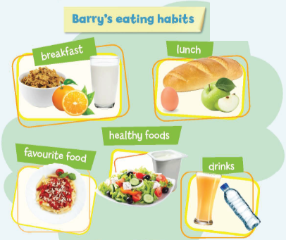 I really like your website and the food page is really good. For breakfast, I 1) have some cereal with milk and an orange. For lunch, at school, 2) have some bread, an apple and egg. My favourite food is 3) pasta. I like to be healthy so I eat a lot of 4) salads and yoghurt. I also drink lots of 5) water and juice. What about you?