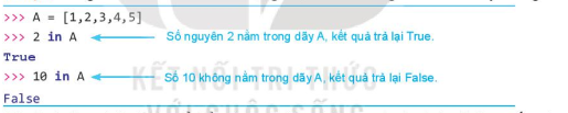 - Kiểm tra một phần tử có nằm trong một danh sách không: Câu lệnh dùng toán tử in. Nếu có trả lại True, nếu không thì trả về False.