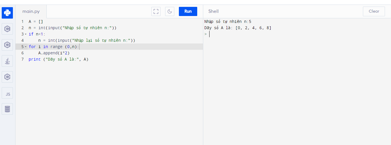 1. Viết chương trình nhập n từ bàn phím, tạo và in ra màn hình dãy số A bao gồm n số tự nhiên chẵn đầu tiên.