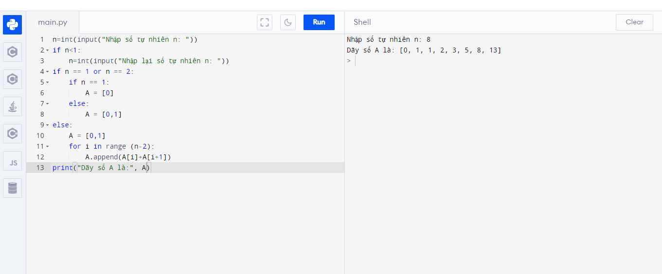 Viết chương trình nhập n từ bàn phím, tạo và in ra màn hình dãy số A bao gồm n số hạng đầu của dãy Fibonacci.