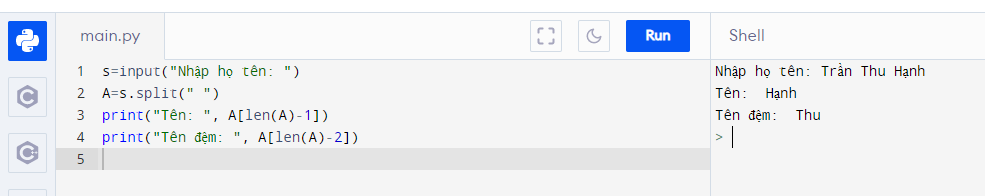 2. Viết chương trình nhập họ tên đầy đủ của người dùng, sau đó in thông báo tên và họ đệm của người đó.