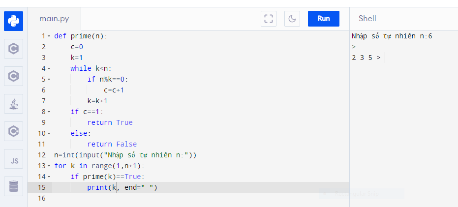 1. Sử dụng hàm prime, em hãy viết chương trình in ra các số nguyên tố trong khoảng từ m đến n với m, n là hai số tự nhiên và 1< m< n.