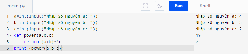 1. Thiết lập hàm power(a,b,c) với a, b, c là số nguyên. Hàm trả lại giá trị (a+b)c