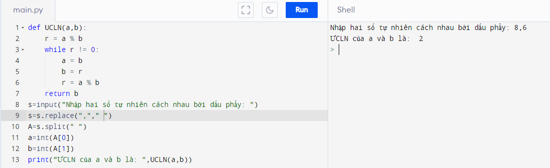 1. Viết chương trình thực hiện: Nhập hai số tự nhiên từ bàn phím, hai số cách nhau bởi dấu phẩy, in ra ước chung lớn nhất (ƯCLN) của hai số.