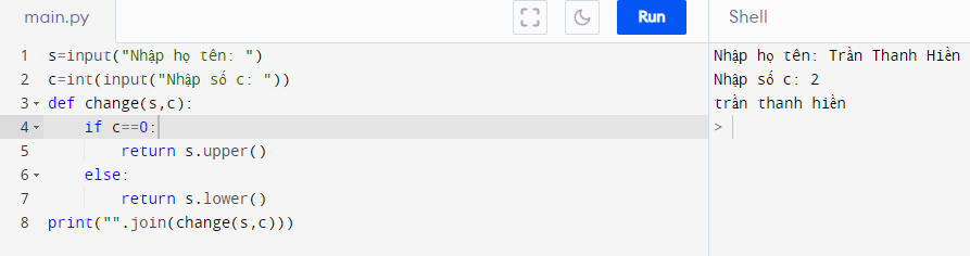 2. Thiết lập hàm change() có hai tham số là xâu ho_ten và số c. Hàm sẽ trả lại xâu kí tự ho_ten là chữ in hoa nếu c = 0. Nếu tham số c khác 0 thì hàm trả lại xâu ho_ten là chữ in thường.