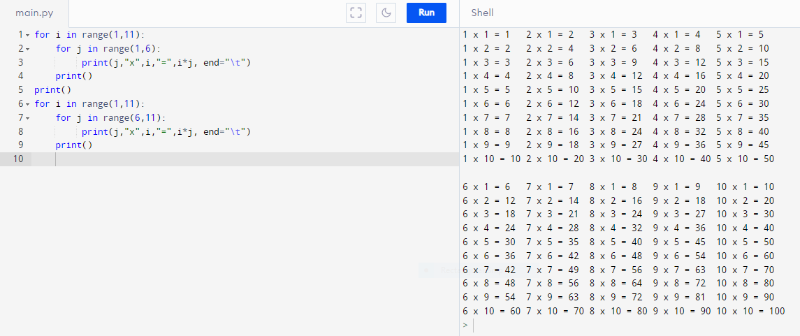 print(j,"x",i,"=",i*j, end="\t")