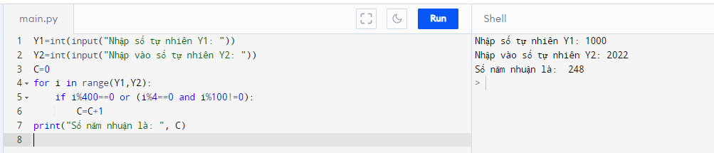 1. Viết chương trình nhập hai số tự nhiên Y1, Y2 là số năm, Y2 > Y1. Tính xem trong khoảng thời gian từ năm Y1 đến năm Y2 có bao nhiêu năm nhuận. Áp dụng tính xem trong thế kỉ XXI có bao nhiêu năm nhuận.