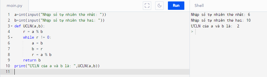 print("ƯCLN của a và b là: ",UCLN(a,b))
