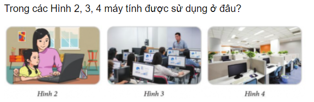 Em hãy đoán xem các bạn ở hình một lại hứng thú như vậy. Trong các Hình 2, 3, 4 máy tính được sử dụng ở đâu? Quan sát các Hình 5 và 6, cho biết máy tính có những thành phần nào và chức năng của chúng là gì?
