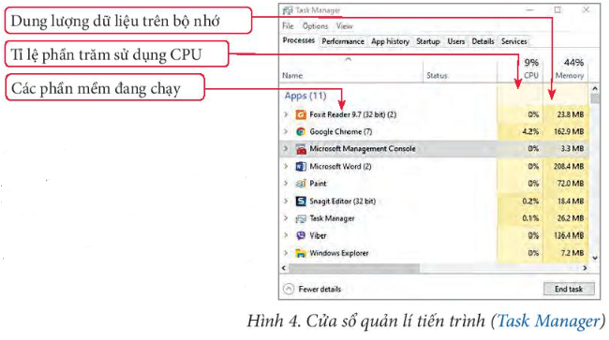 a) Cửa sổ quản lí tiến trình (Hình 4) cho biết các phần mềm đang chạy, tỉ lệ phần trăm sử dụng CPU, dung lượng dữ liệu trên bộ nhớ của mỗi tiến trình.