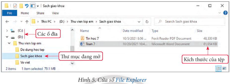 Ví dụ 5. Cửa sổ File Explorer (Hình 5) cho thấy cách tổ chức lưu trữ dữ liệu trong ổ đĩa D. Ta có thể xem được nơi lưu trữ thư mục và tệp, kích thước của tệp…