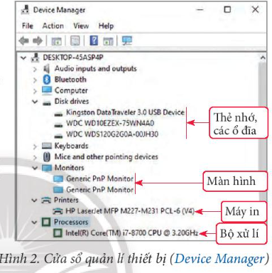 b) Thông tin về các thiết bị của hệ thống được cung cấp bởi trình quản lí thiết bị (Hình 2).