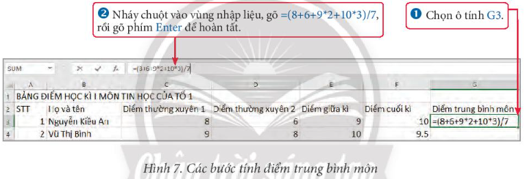 Sắp xếp các bước dưới đây để tính điểm trung bình môn của bạn Vũ Thị Bình thông qua vùng nhập liệu.