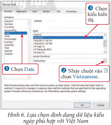 - Sau khi chọn ô tính cần định dạng, mở hộp thoại Format Cells, rồi thực hiện các bước ở Hình 6 để lựa chọn khuôn dạng trình bày phù hợp với Việt Nam như: ngày tháng/năm, ngày - tháng - năm, ...