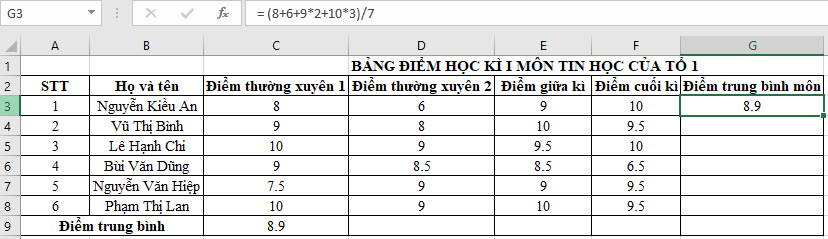 - Điểm trung bình thường xuyên 2: = (6+8+9+8.5+9+9)/6