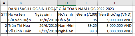 a) Thực hiện định dạng dữ liệu kiểu số, ngày, hiển thị kí hiệu tiền tệ kèm theo tiến thưởng để có trang tính tương tự Hình 9.