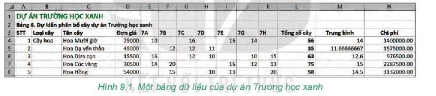 Bảng tính của dự án Trường học xanh trong Hình 9.1 chưa có vạch kẻ ô rõ ràng và đơn điệu. Chúng ta cần chỉnh sửa, định dạng cho bảng tính đẹp mắt và rõ ràng hơn.