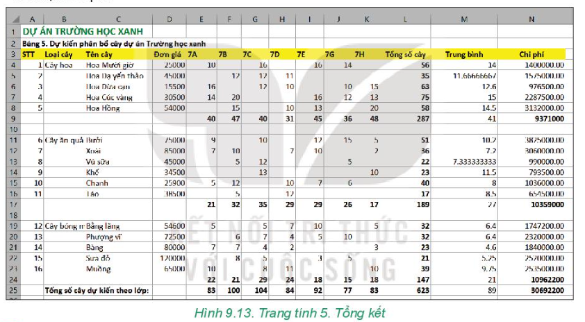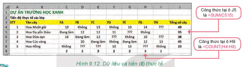 Giả sử nhóm em lập bảng dữ liệu như Hình 9.12 để theo dõi tiến độ thực hiện dự án Trường học xanh. Dữ liệu được nhập vào bảng có thể là số liệu cụ thể hoặc có thể ghi chữ "Không" nếu lớp không có cây này, hoặc ghi "Đang làm" nếu lớp đã thực hiện nhưng chưa có số liệu, ghi "???" nếu chưa biết thông tin gì. Cột cuối cùng luôn tính Tổng số cây theo từng loại, hàng cuối sẽ đếm số loại cây đã trồng của mỗi lớp.