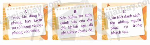 Xét vấn đề sau: Chuẩn bị cho một chuyến du lịch, gia đình em đã đăng kí phòng ở một khách sạn qua một website. Trên website đó có giới thiệu địa chỉ của khách sạn, số lượng và loại phòng còn trống trong các ngày để khách đăng kí. Có một số lời khuyên về đặt phòng khách sạn qua website đó, em nghe theo lời khuyên nào? Vì sao?