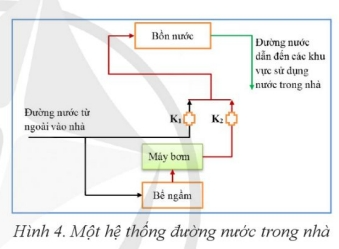Hình 4 biểu thị một hệ thống đường nước trong nhà. Một nhóm học sinh đã đưa hình ảnh này vào bài trình chiếu để trao đổi, thảo luận nhằm giải thích tác dụng của hai van nước một chiều k1 và k2. Trong cuộc sống hằng ngày, chung ta gặp nhiều câu hỏi hoặc vấn đề tương tự như câu trên, cần cùng nhau tìm hiểu và giải quyết.