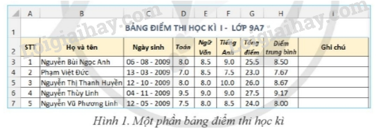 Với bảng điểm như trong Hình 1, em hãy thiết lập xác thực dữ liệu cho khối ô điểm ba môn học để chỉ số nhập được số thập phân trong khoảng từ 0 đến 10.
