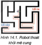 Mê cung được dùng để chỉ những công trình gồm nhiều hành lang, lối đi, được tạo thành từ những bức tường. Một robot xuất phát từ Lối vào, tìm đường tới Lối ra như hình 14.1. Em hãy quan sát cách di chuyển của robot và trả lời các câu hỏi sau: