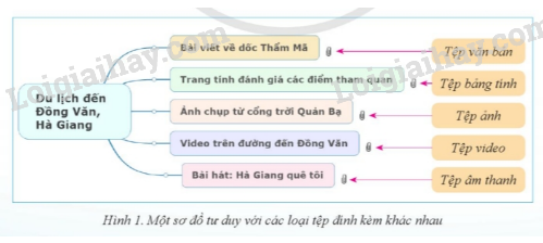 Hình 1 minh họa 5 loại tệp được đính kèm vào sơ đồ tư duy trong phần mềm MindManager. Dấu hiệu nào giúp em nhận ra có tệp đính kèm? Hãy phân biệt giữa “đính kèm” (ảnh,video,…) với “chèn” (ảnh, video,…) vào sơ đồ tư duy.