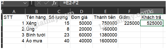 - Thực hiện điền giá trị cho cột giảm giá theo quy tắc: Nếu số lượng của một mặt hàng từ 3 trở lên thì giảm giá bằng 30% của Thành tiền, còn lại giảm giá bằng 0
