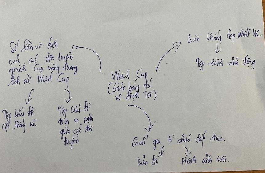 1. Hãy vẽ trên giấy sơ đồ tư duy trình bày nội dung chính của bài trình chiếu về World Cup ở câu 2 tại hoạt động Làm của mục 1. Trao đổi với bạn và cho biết các tệp hình ảnh, biểu đồ, video em dự kiến đính kèm khi tạo sơ đồ tư duy trên máy tính.