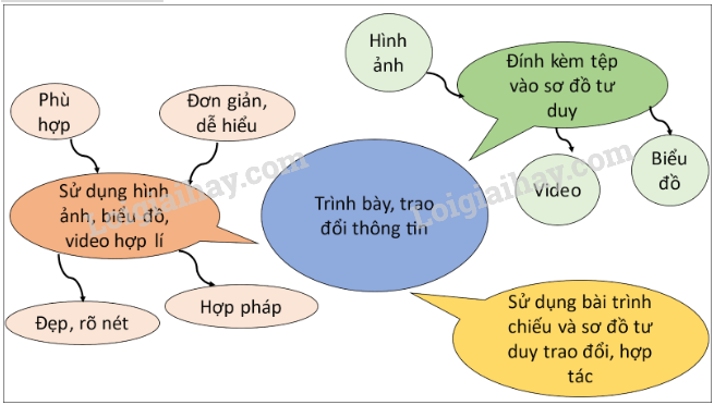 c. Sử dụng sơ đồ tư duy đã tạo ở câu b) để trao đổi với bạn về nội dung, phương tiện trực quan em dự kiến sử dụng để trình bày thông tin trong bài trình chiếu; lấy ý kiến góp ý của bạn để chỉnh sửa, hoàn thiện sơ đồ tư duy.