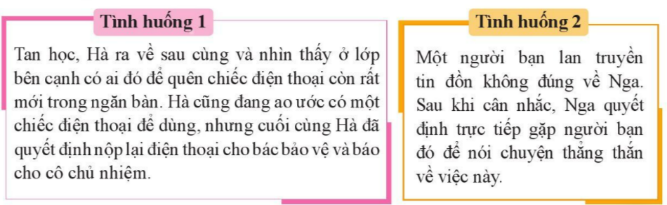 - Tình huống 1: Dù đang ao ước có một chiếc điện thoại để dùng nhưng Hà quyết định nộp lại chiếc điện thoại trong ngăn bàn lớp cho bác bảo vệ và báo cho cô chủ nhiệm.