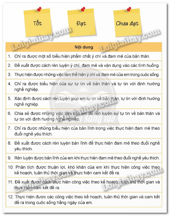 HS tự đánh giá các mức độ mình đạt được trong việc thực hiện các mục tiêu của chủ đề theo ba mức độ Tốt/ Đạt/ Chưa đạt.