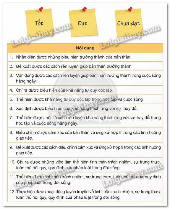 HS tự đánh giá các mức độ mình đạt được trong việc thực hiện các mục tiêu của chủ đề theo ba mức độ Tốt/ Đạt/ Chưa đạt.