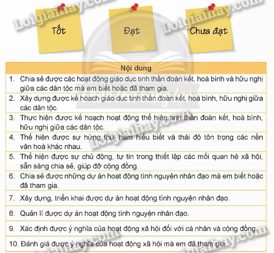 HS tự đánh giá các mức độ mình đạt được trong việc thực hiện các mục tiêu của chủ đề theo ba mức độ Tốt/ Đạt/ Chưa đạt.