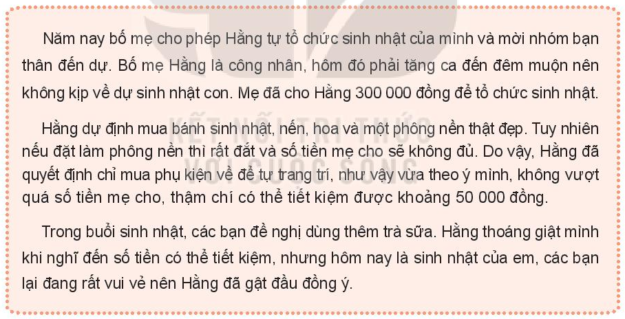 - Bạn Hằng đã chi tiêu cho sinh nhật mình như thế nào? Cách chi tiêu đó có phù hợp không?