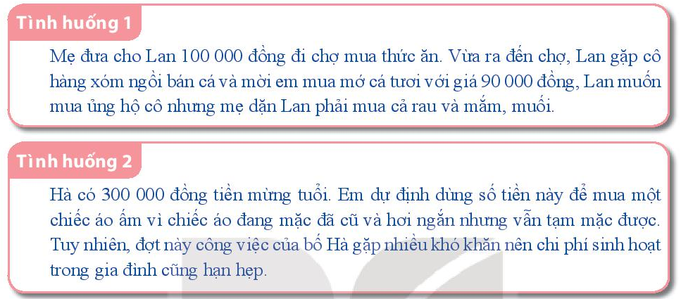 Em đọc kỹ tình huống và đưa ra cách cư xử hợp lý nhằm kiểm soát chi tiêu và tiết kiệm tiền.