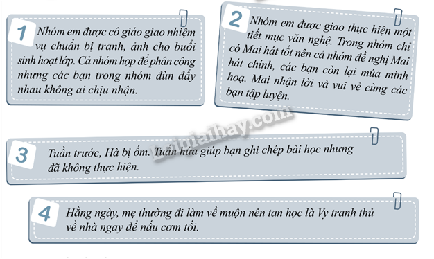 * Tình huống 3: Em nên hoàn thành công việc nhà theo đúng sự phân công trách nhiệm từ trước rồi mới đi chơi với bạn bè. Hoặc có thể linh động bằng cách hỏi ý kiến chị về việc giúp đỡ em hôm nay và em sẽ làm bù phần của chị vào ngày mai.