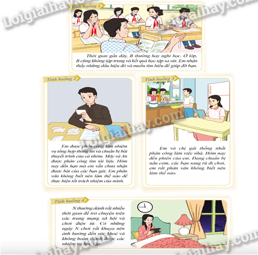 * Tình huống 4: Em cần hoàn thành tốt bài tập của mình và cần có trách nhiệm với sức khỏe của bản thân bằng việc đi ngủ sớm, điều chỉnh thời gian chơi và học một cách phù hợp.