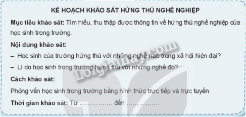 Phương pháp giải: Tìm hiểu và tham khảo gợi ý để lập 1 kế hoạch khảo sát hứng thú nghề nghiệp của các bạn trong lớp, trong trường.