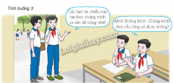- Tình huống 3: Bạn nên từ chối khéo với bạn rằng nay bọn mình có hẹn chơi cầu lông rồi chúng ta sẽ chơi đá bóng vào buổi khác nhé.
